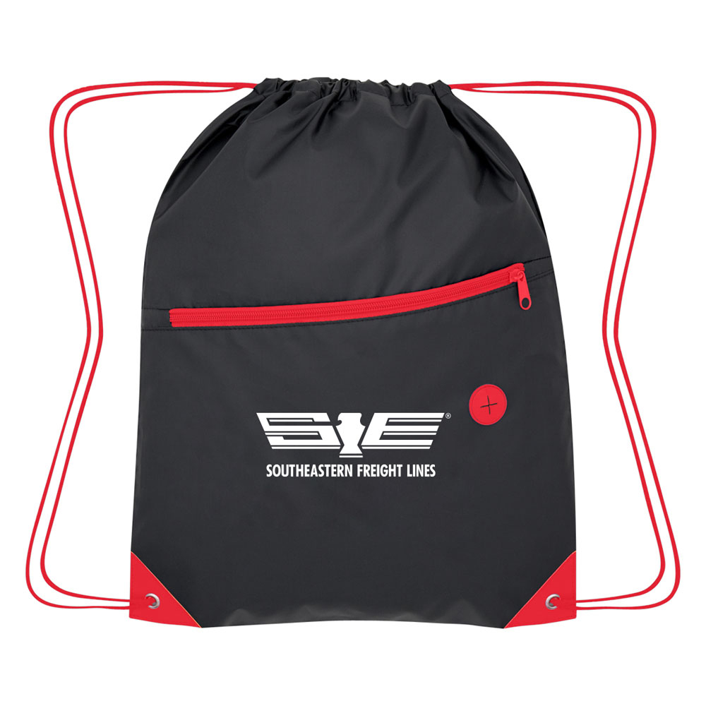 Lightweight drawstring backpack made of 210D Polyester. Black with red pops of color. Features angled zipper pocket, earbud port, reinforced eyelets and adjustable drawstring closure. Dimensions: 13.5" W x 17.75" H